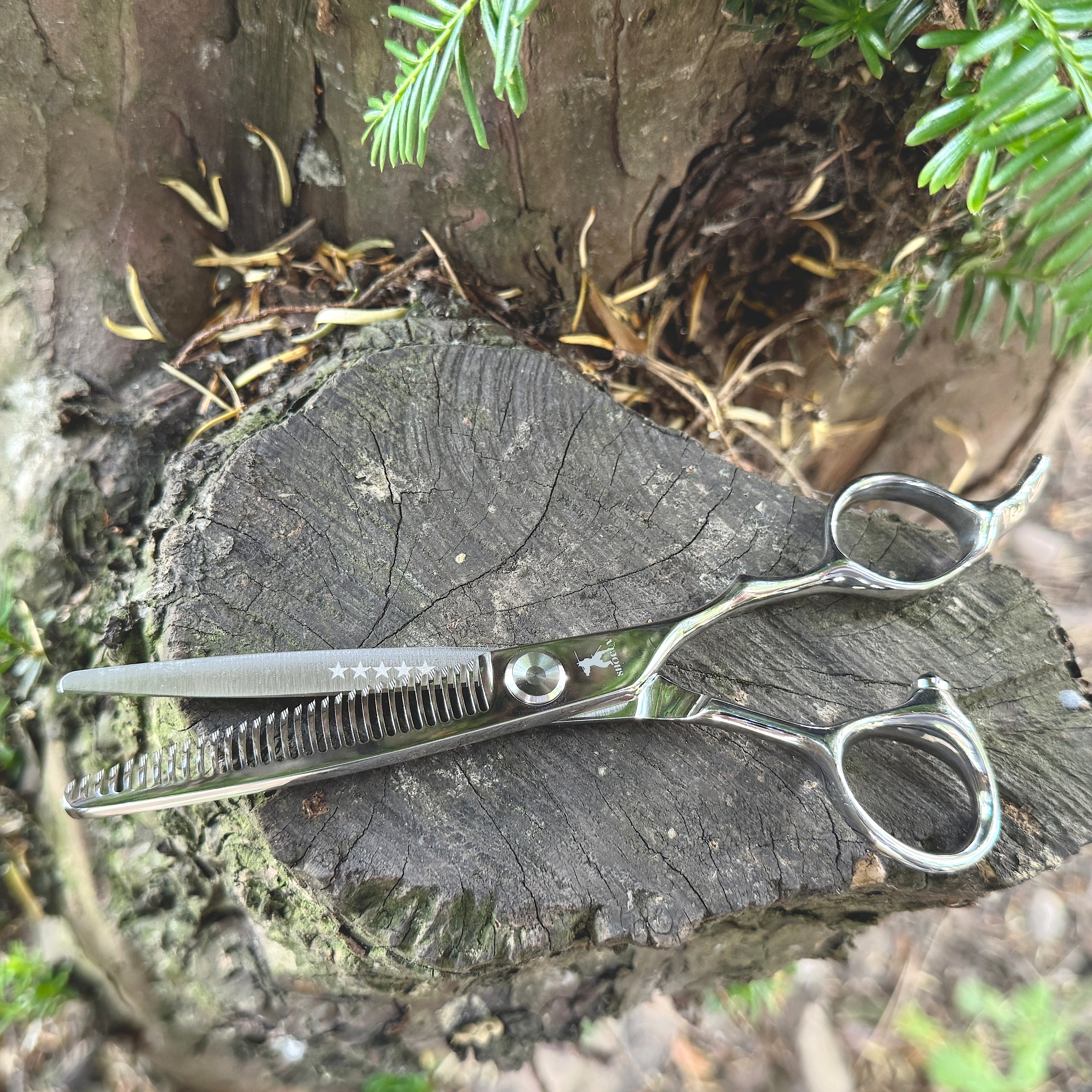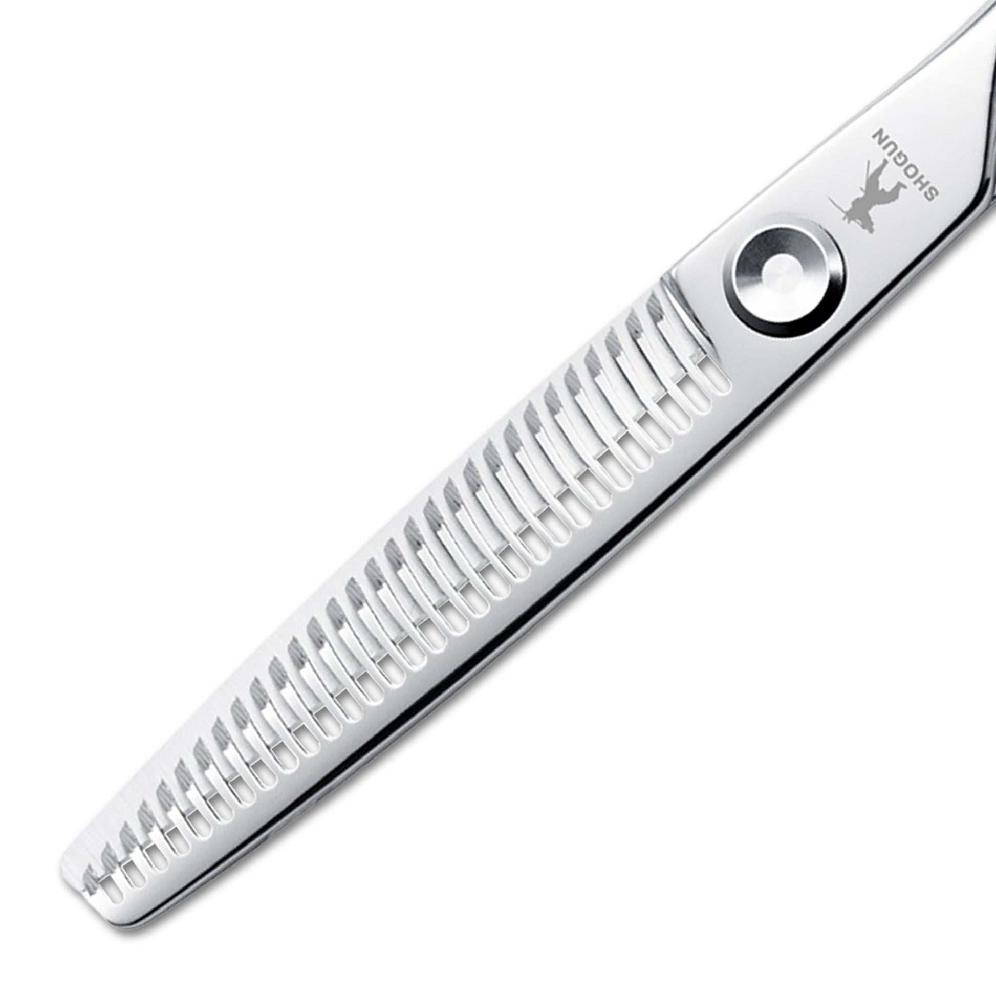 Introducing the SHOGUN EVO Thinner: Expertly designed for seamless thinning and texturising, the SHOGUN EVO Thinner ensures precision and effortless control. Crafted with premium materials and an ergonomic grip, these scissors provide a smooth, balanced feel for maximum comfort. Whether you're a professional stylist or a home user, achieve flawless, natural-looking texture with every cut. Elevate your craft with the perfect blend of performance and style.